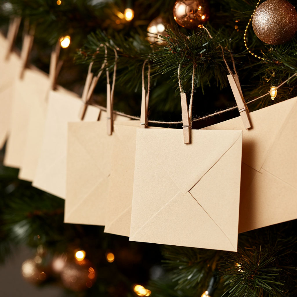 Что понадобится: конверты (можно собрать из бумаги, обклеить винтажными открытками или купить готовые, бечевка, прищепки, трафареты с цифрами или маркер, элементы декора (ветки, ягоды).