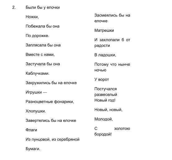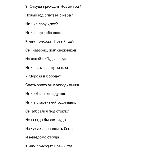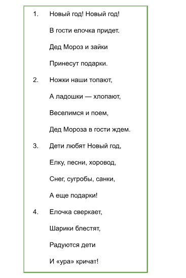 В возрасте 2–3 лет малыш воспринимает мир через чувства: прикосновения, движения, звук. Память еще короткая, поэтому тексты должны быть ритмичными, с повторениями, знакомыми образами: елка, снег, подарки, Дед Мороз. Хорошо, когда стих можно сопровождать движением или игрушкой — это помогает запоминанию и делает процесс веселым. При желании можно взять одно четверостишие из большого стиха.
