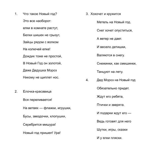 - «Подарки под елкой» — стихотворение, где ребенок может рассказать о том, как он с нетерпением ждет момента, когда откроет свои подарки.