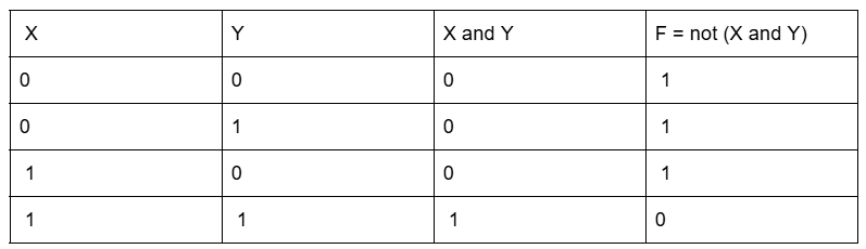 Допустим, у нас выражение F = not (X and Y). Построим для него таблицу: