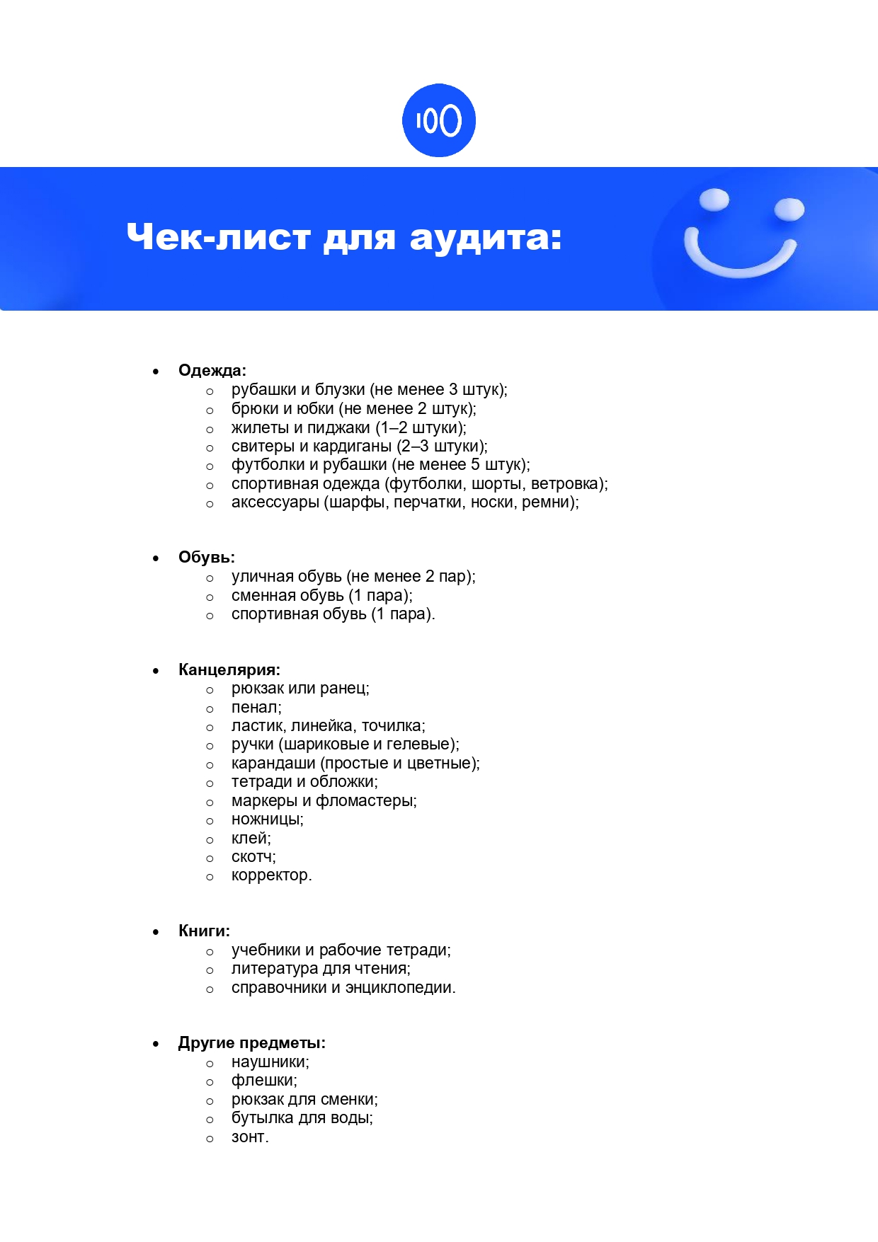 - Разложите все вещи по категориям: школьная форма, повседневная одежда, спортивная форма, обувь (уличная и сменная), аксессуары, канцелярия (письменные принадлежности, книги), другие предметы.