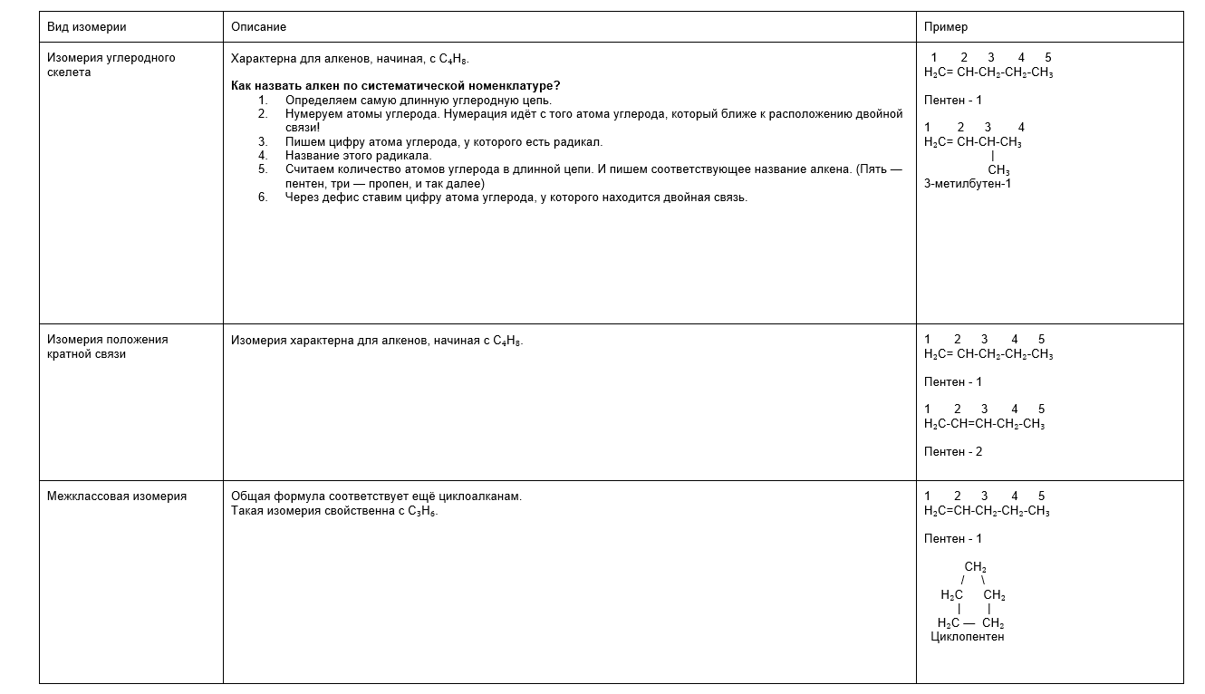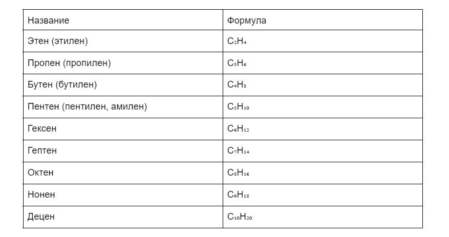 Гомологический ряд алкенов расположился в таблице ниже.