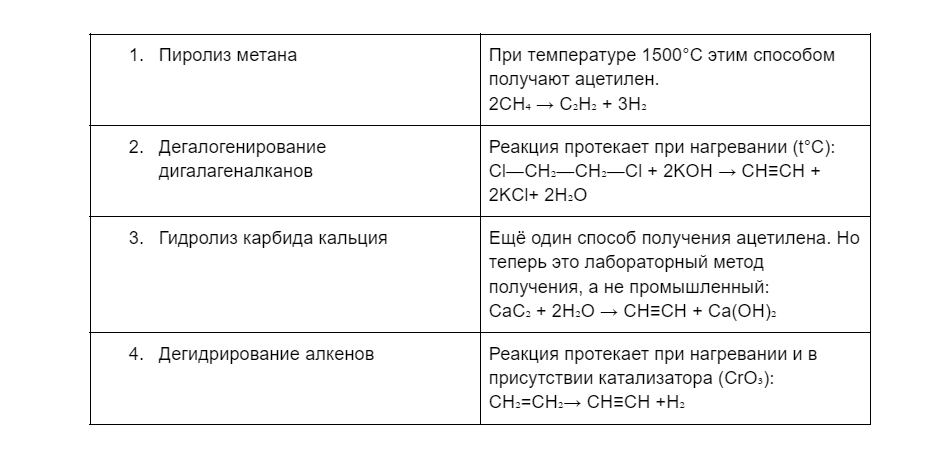 Как бы это грустно не звучало, алкины в природе днем с огнем не сыщешь. Точнее их нашли в мизерных количествах у какого-то вида грибов, а ещё в атмосфере планет-гигантов, но человечеству от этого не легче. Поэтому рассмотрим в таблице несколько реальных методов изготовления алкинов.