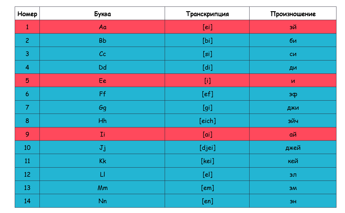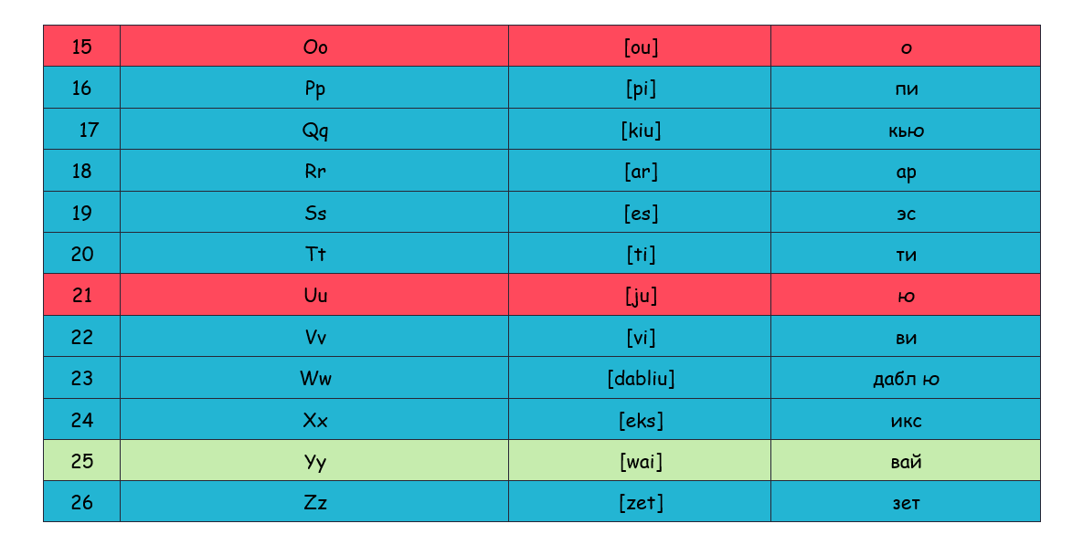 Чтобы облегчить процесс запоминания, мы составили таблицу всех обитателей английского алфавита с их нумерацией, транскрипциями и произношением на русском языке. При необходимости ее можно распечатать и использовать в качестве справочного материала. Гласные выделены розовым цветом, согласные - голубым, а красавица Yy — зеленым.