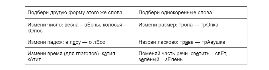 2) Измени форму слова (число или падеж): река – рЕки, в лесу – о лЕсе. Помогло?