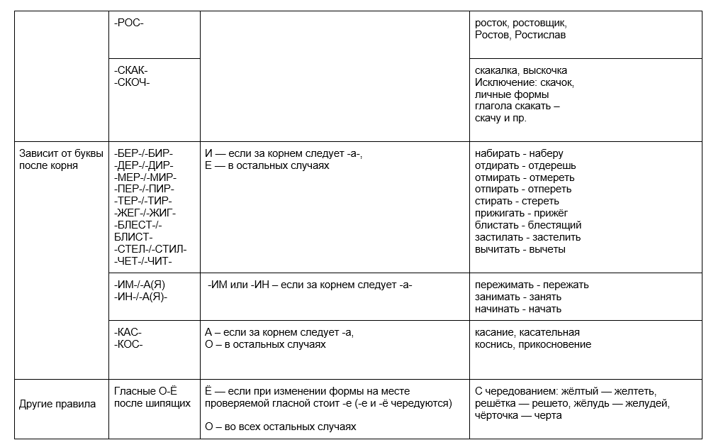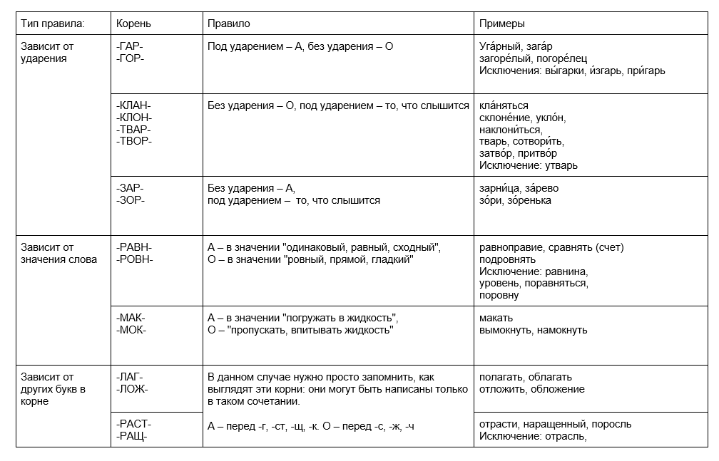 Таблица с примерами и исключениями поможет усвоить правило написания корней слов с чередующимися гласными в русском языке.