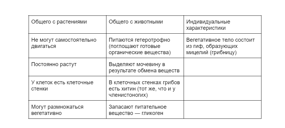 В таблице для тебя кратко отметили, что именно делает грибы такими особенными.