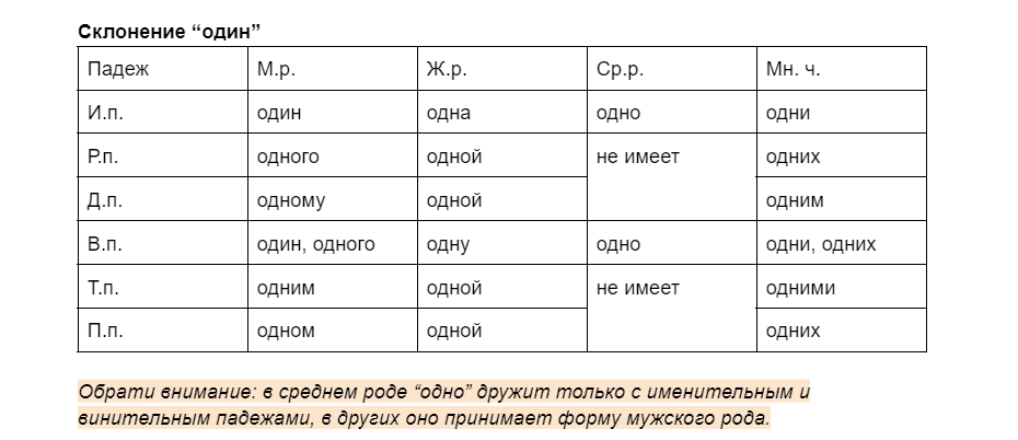 1) Склонения числительного “один”