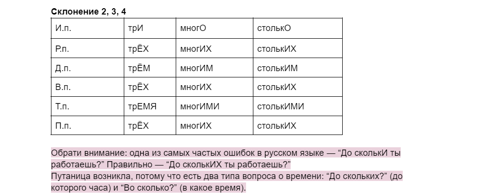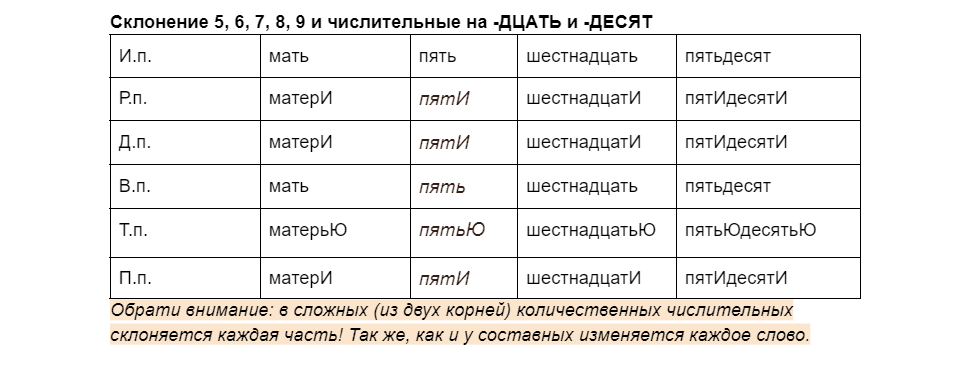 3) Идем дальше! 5, 6, 7, 8, 9 и числительные на -ДЦАТЬ и -ДЕСЯТ изменяются как существительные 3 склонения.