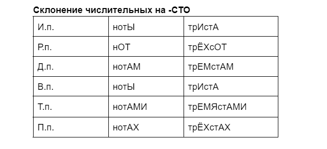 5) У сложных и составных числительных на -СТО эта концовка меняется, как слово НОТЫ. Первая часть при этом склоняется как простое количественное.