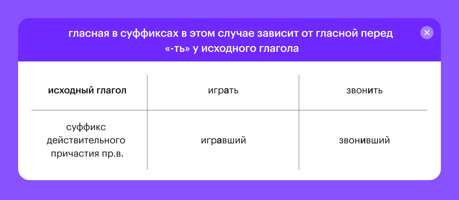 Для того чтобы получить действительное причастие прошедшего времени (уже перешли к цифре 2), нужно к корню исходного глагола добавить другой суффикс. Кстати, радуемся, здесь вариант всего один — всегда добавляем «-вш-». Но сложность может возникнуть при выборе гласной, которую мы поставим перед суффиксом.