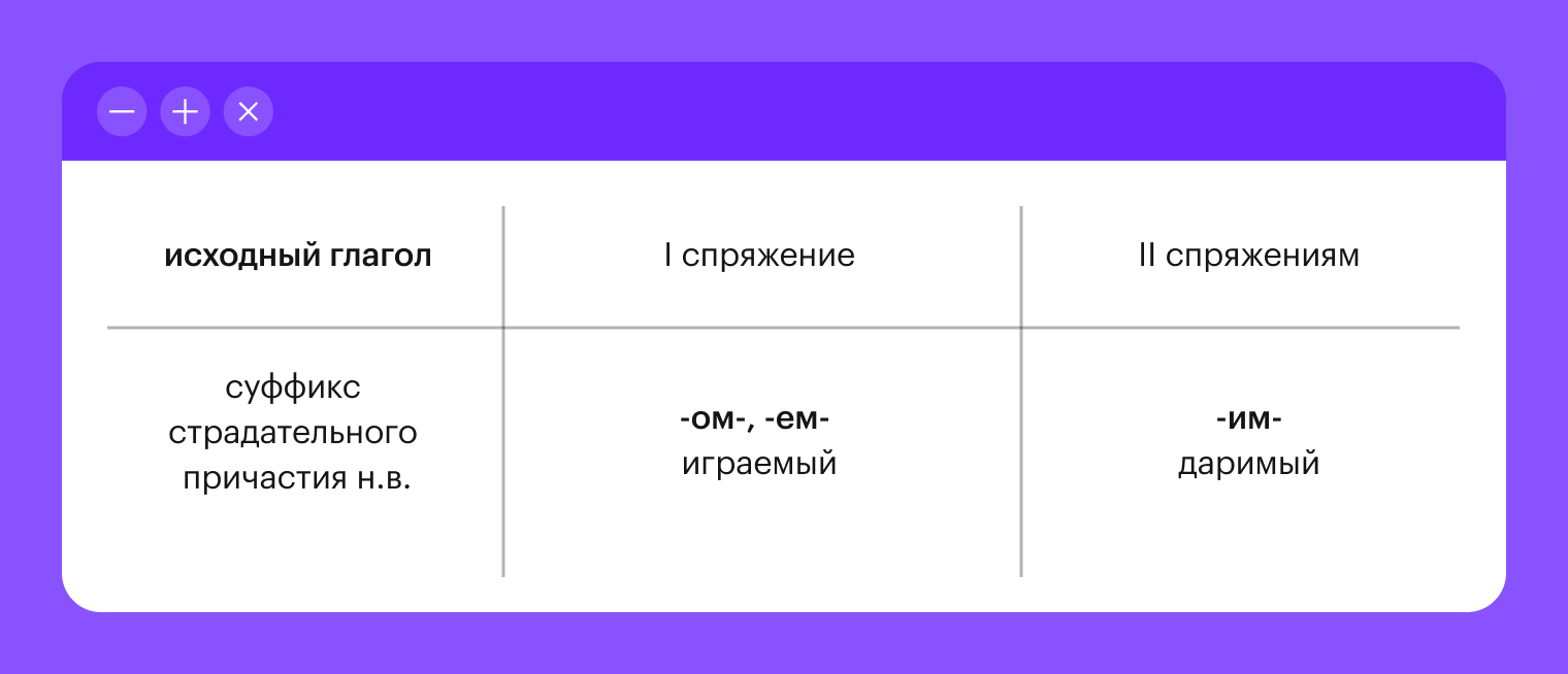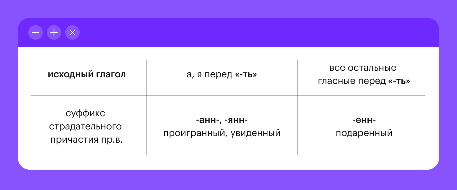 Ну и вишенка на торте, страдательное причастие прошедшего времени (цифра 4). Для того чтобы образовалось именно это причастие, нужно к корню исходного глагола добавить суффикс «-н-», «-нн-» или «-енн-».