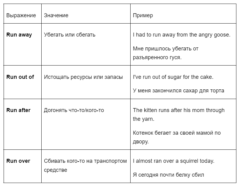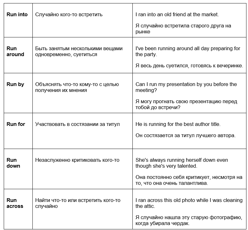 Если мы употребим глагол с определенным предлогом, то получим абсолютно новое выражение. Наш сегодняшний герой — не исключение. Запоминаем таблицу фразовых глаголов с “run”: