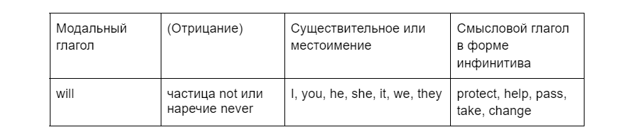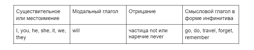 Формула образования отрицания в Future Simple: