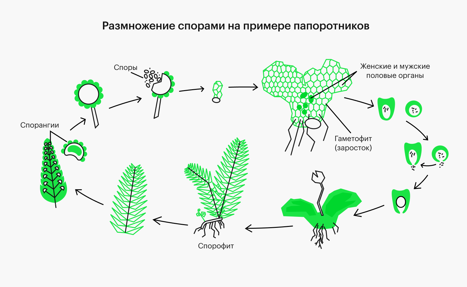 Казалось бы, спорофит сильнее развит — значит, растения размножаются спорами. Но нет! Размножение спорами не так уж и популярно. Активнее всего так размножаются мхи (и про них у нас есть отдельная статья)