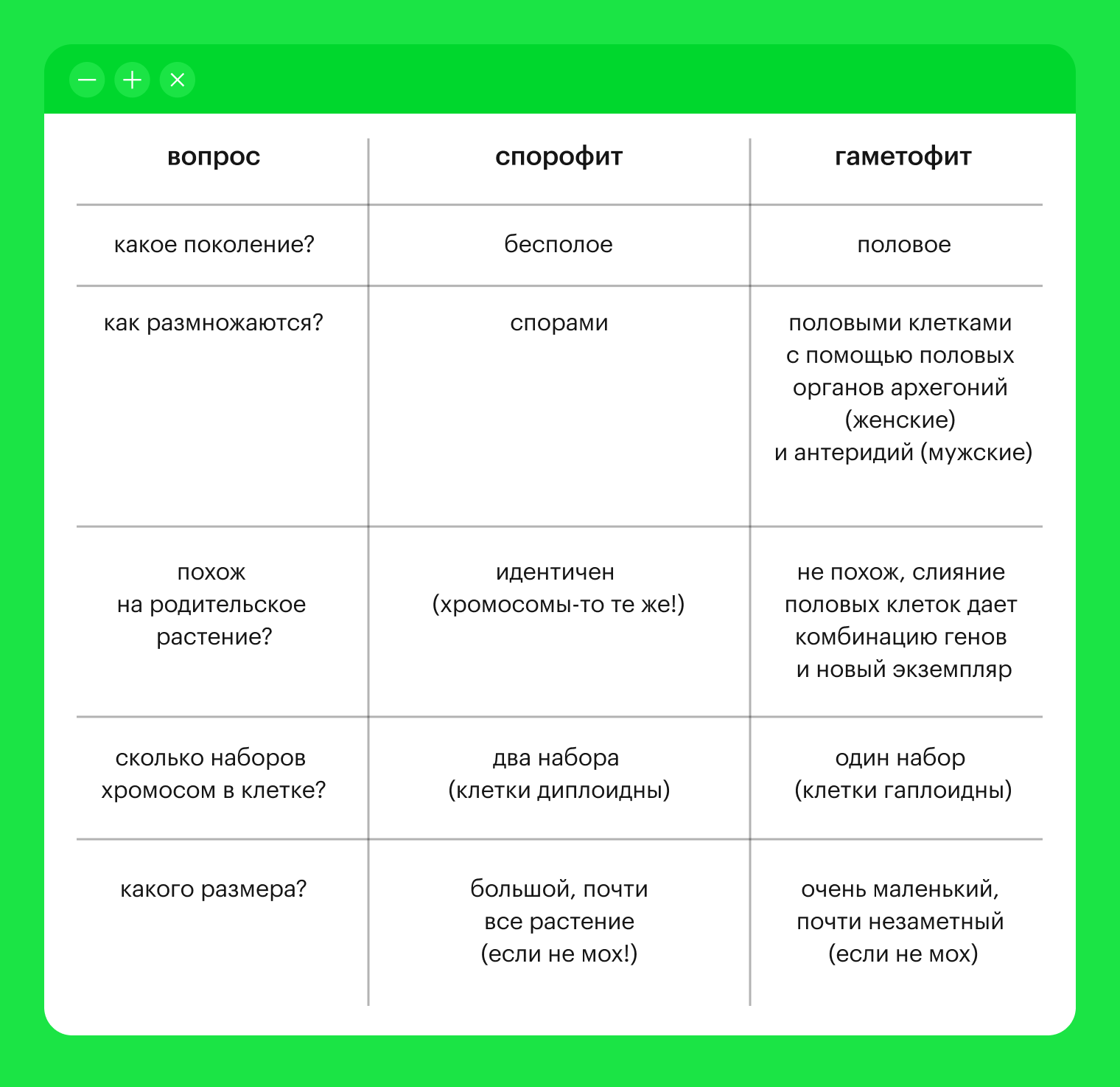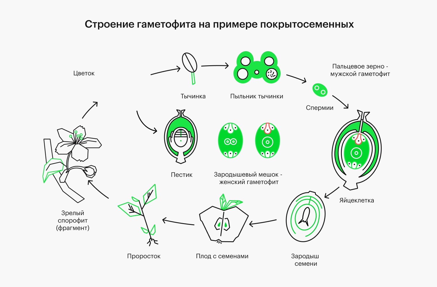 Легко запомнить: если тебе описывают процесс размножения растения, и он чем-то напоминает размножение у людей (слияние клеток, зигота, рост — что-то такое) — речь про гаметофит.