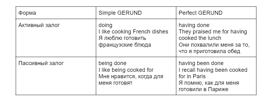Чтобы получше запомнить формы герундия и различия между ними, обратимся к таблице: