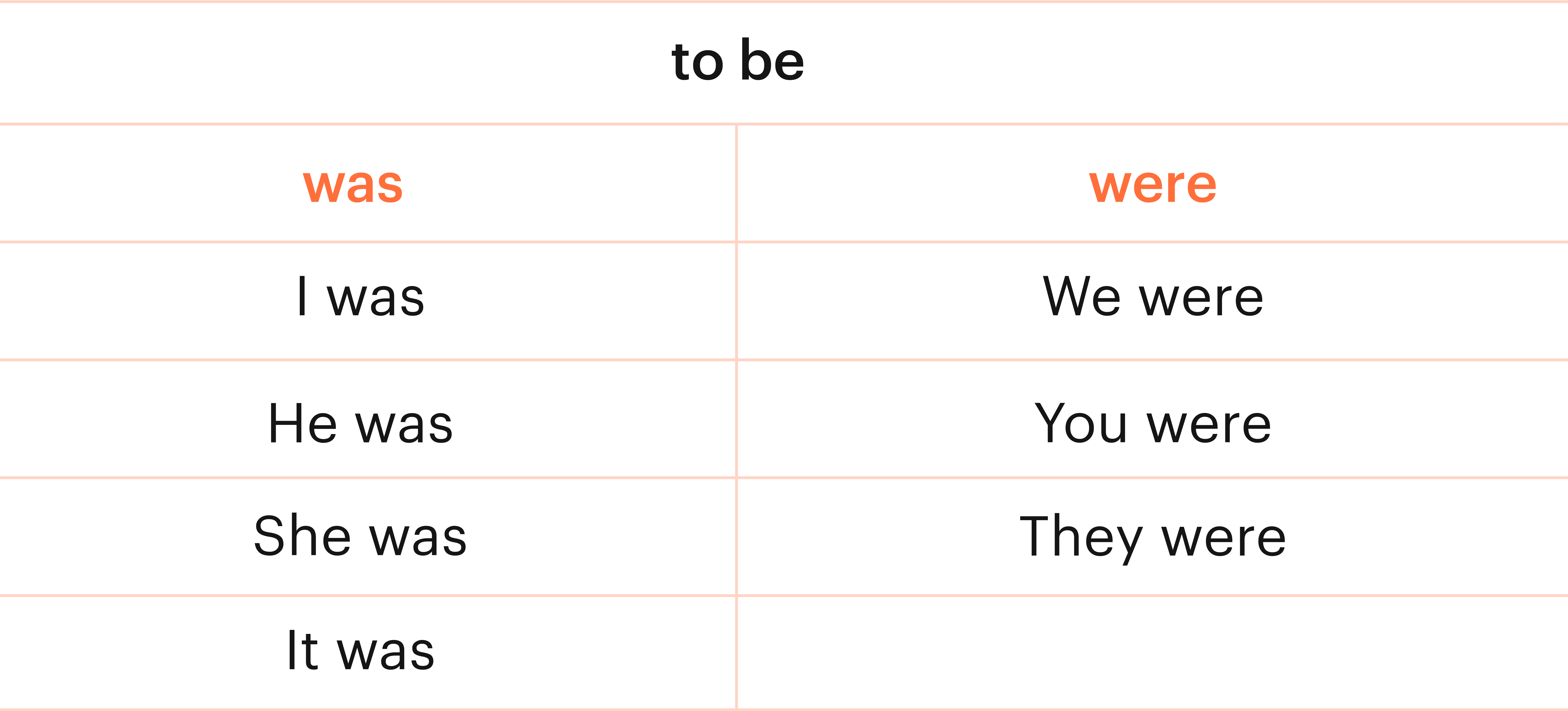 Их всего две: was для единственного числа и were — для множественного (включая you, который, как мы помним, по-английски значит не только «ты», но и «вы» при обращении к группе людей). Говорим об одном человеке или предмете — используем was. О нескольких — were.