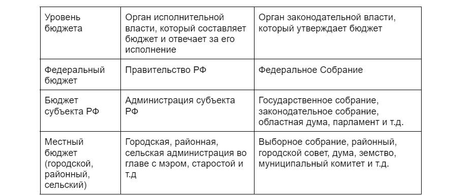 Россия — Федеративное государство, следовательно, у нас несколько уровней бюджета: Федеральный, Субъектный и Муниципальный. На каждом уровне за составление и утверждение бюджета отвечают свои государственные органы.