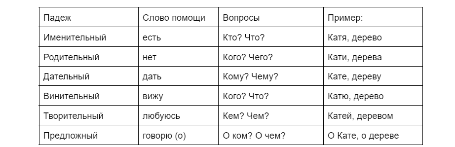 Существительные можно поставить в шесть падежей. У нас про них есть отдельная большая статья, а вкратце можешь посмотреть таблицу ниже.