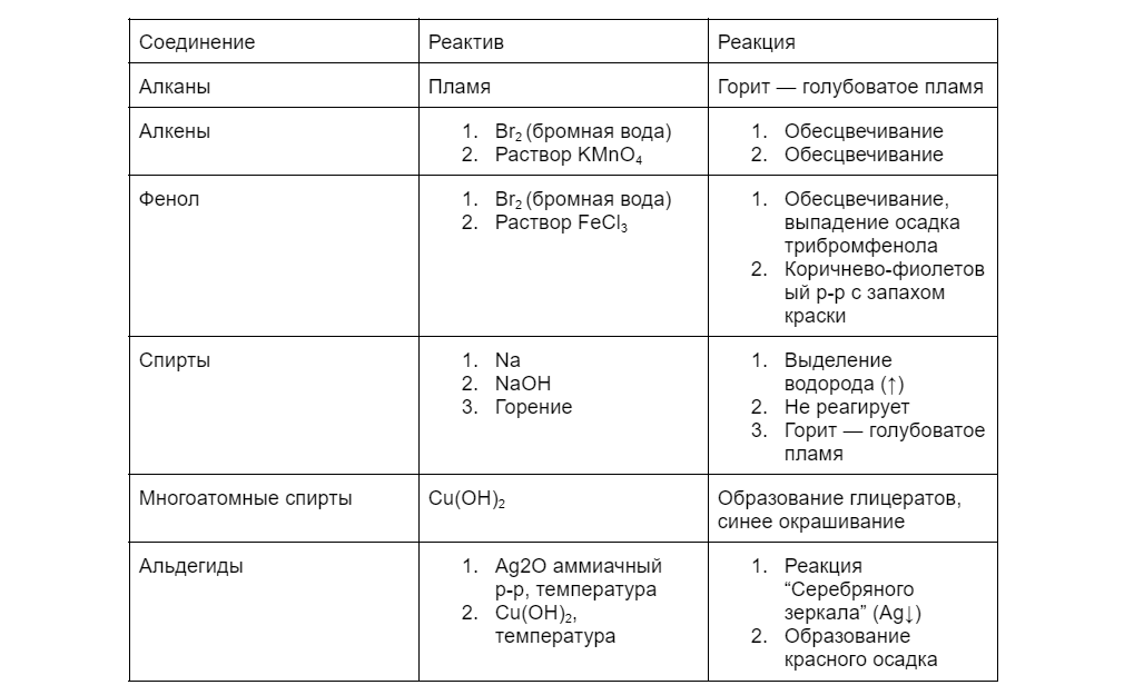 Вот основные качественные реакции органических веществ и реактивы для них.