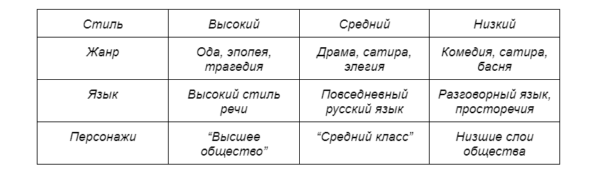В данной таблице можно узнать, о каких же трёх стилях писал Ломоносов. Они отличаются жанром, языком и даже изображавшимися в них героями.