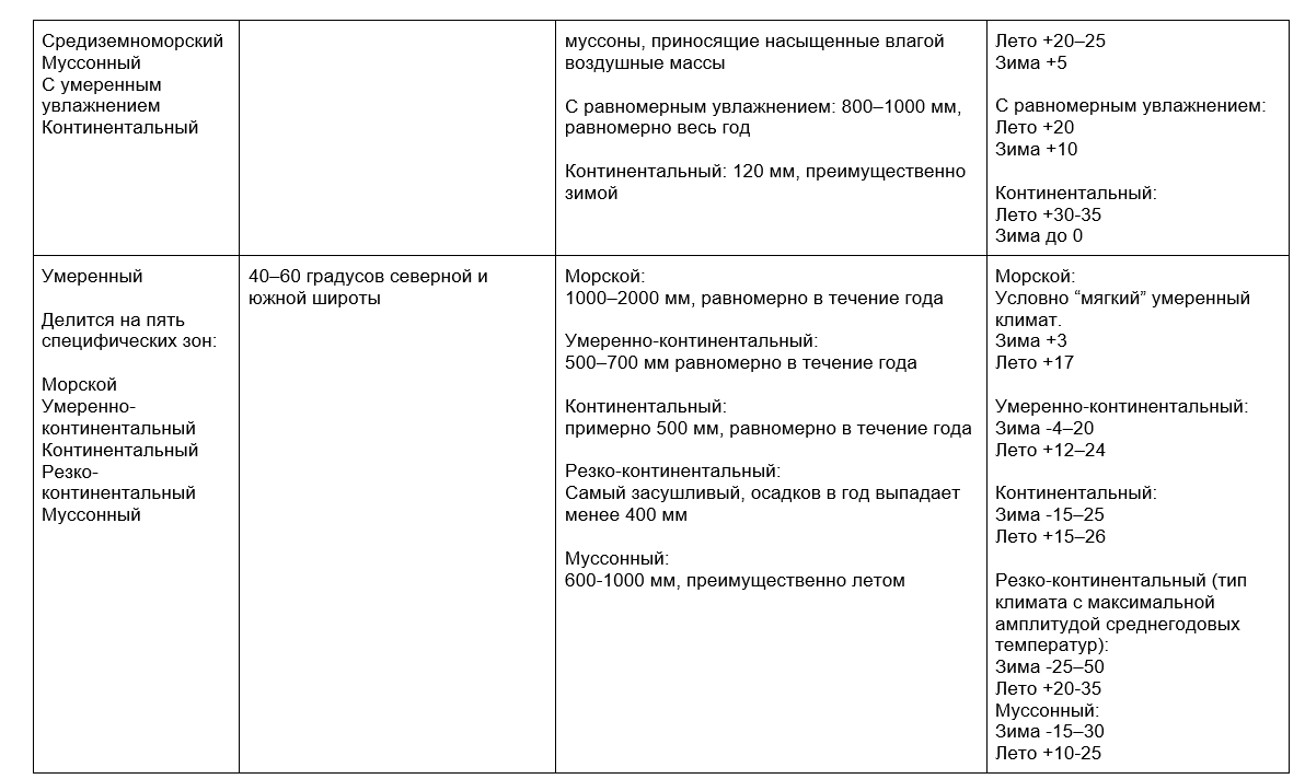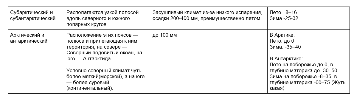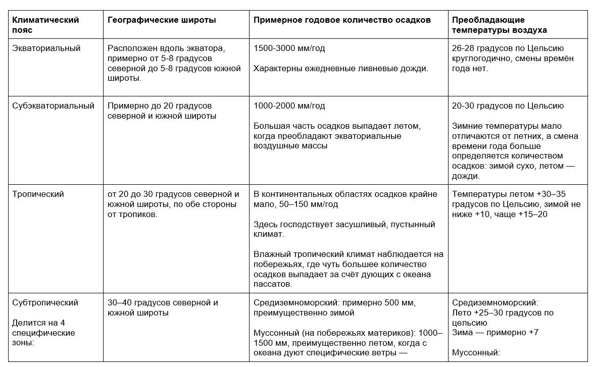 В представленной ниже таблице можно ознакомиться основными характеристиками климатических поясов Земли.