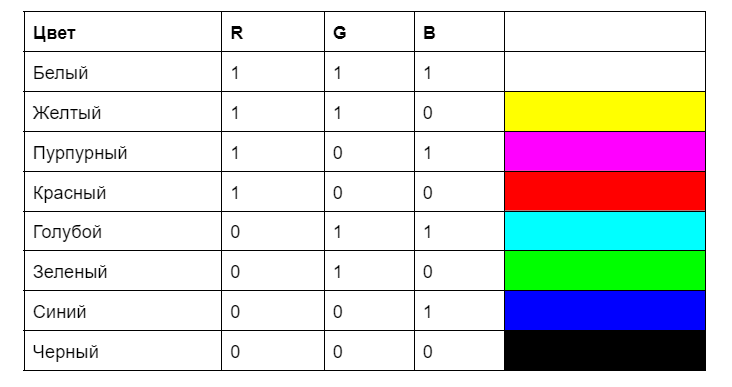 Логику увидеть легко: 1 — этот цвет есть, 0 — этого цвета нет. Соответственно, белый — это сочетание всех цветов спектра, 111. Черный — отсутствие всех цветов, 000. Красный — 100, так как это первый из основных цветов модели RGB. А пурпурный — это смесь красного и синего, то есть 101.