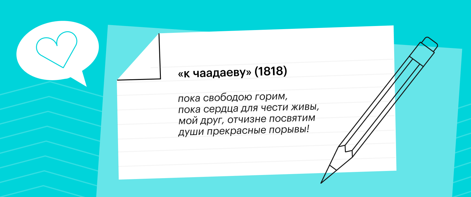 Стихотворение «К Чаадаеву» продолжает тему свободу, но этот мотив в произведении переплетается с темой дружбы. Лирический герой говорит о дружбе как о единении людей с общими интересами и целями. А свобода для лирического героя — высшая цель и высшая ценность, то, за что стоит бороться, и то, чему стоит посвятить всю энергию их с друзьями общей молодости.