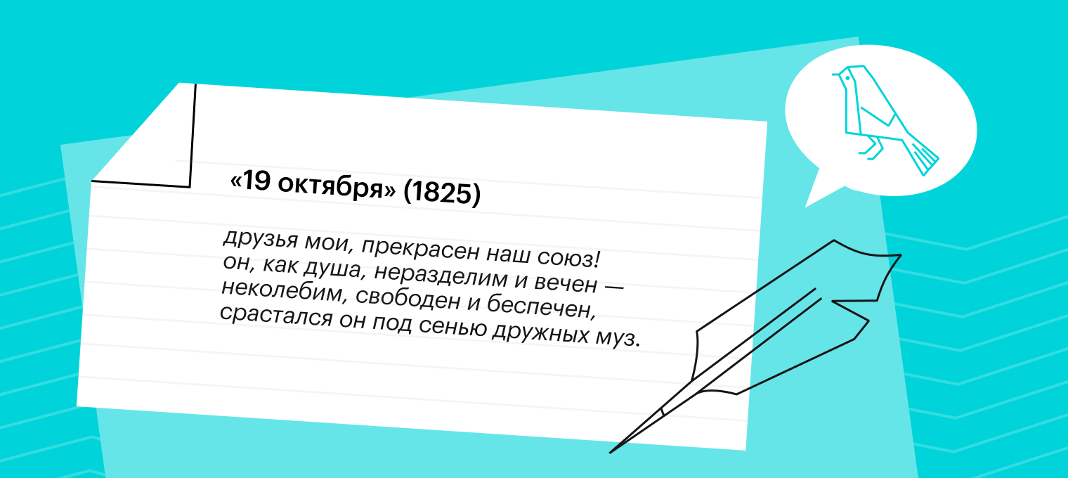 «19 октября» — одно из главных произведений, связанных с темой дружбы. Это монолог-воспоминание лирического героя, в котором он обращается к товарищам, знакомым ему со времен лицея. Он расстроен, что не может провести этот день с ними, но, несмотря на то, что судьба разлучила друзей, лирический герой Пушкина верит, что их союз «неразделим и вечен» — и что долгожданная встреча все же случится.