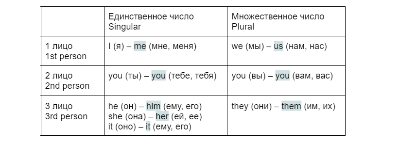 - Для всех падежей, кроме именительного — то есть, когда действие выполняется над субъектом, — в английском языке используется форма Object Pronouns (вторая форма в таблице выше).