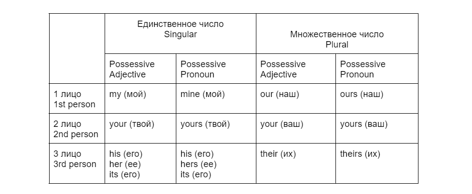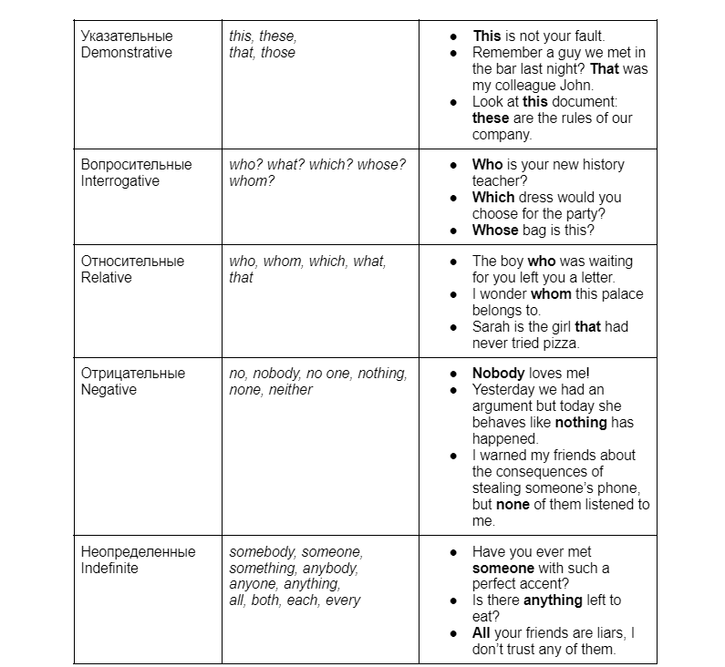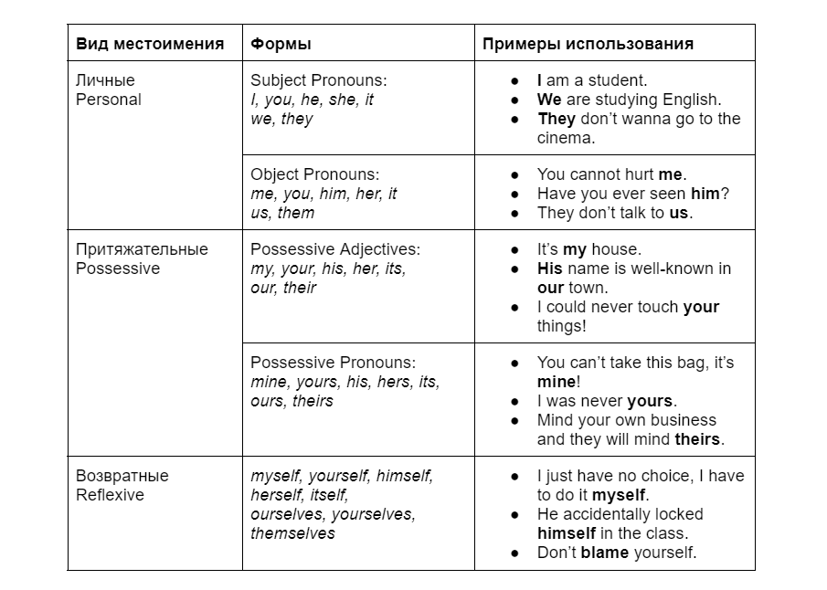 Таблица английских местоимений с примерами