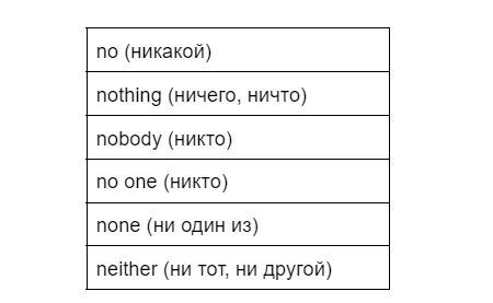 Отрицательные местоимения в английском языке носят название Negative Pronouns, и вот как они выглядят.