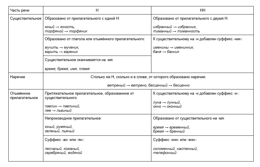 Правила правописания Н и НН в разных частях речи: таблица