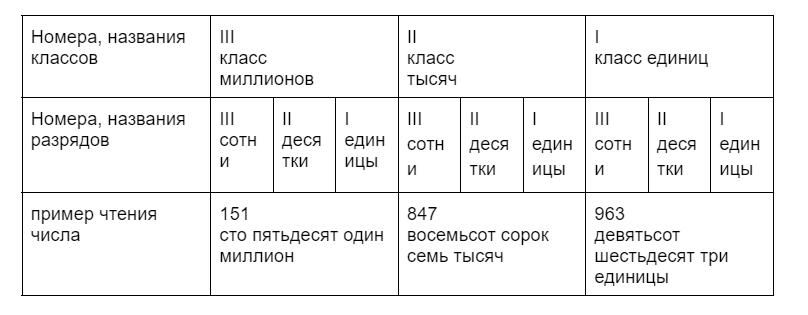 Например, класс единиц содержит единицы, десятки и сотни, класс тысяч – тысячи, десятки тысяч и сотни тысяч, класс миллионов – миллионы и так далее.