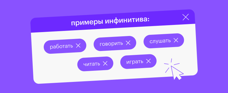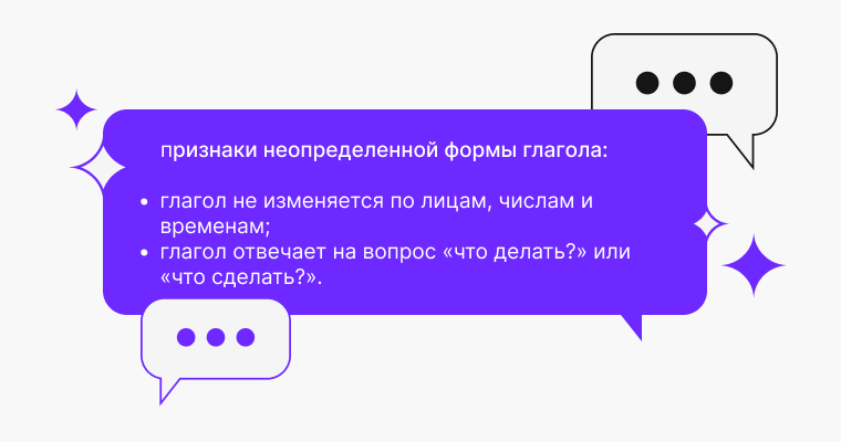 Инфинитив всегда отвечает на вопросы «что делать?» или «что сделать?». Он обозначает действие в общем виде — без указания на конкретное действующее лицо или время, в которое это действие происходит.
