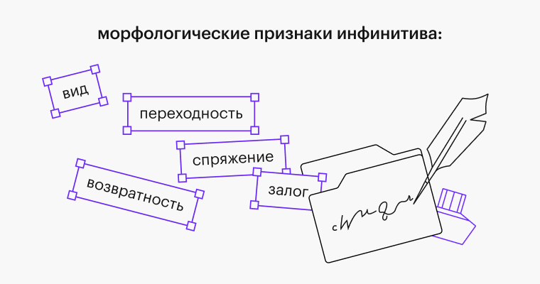 Инфинитив имеет несколько морфологических признаков, которые наделяют глагол более конкретными характеристиками и дают нам хоть какие-то подробности о происходящем (раз уж лицо, число и время узнать не суждено).