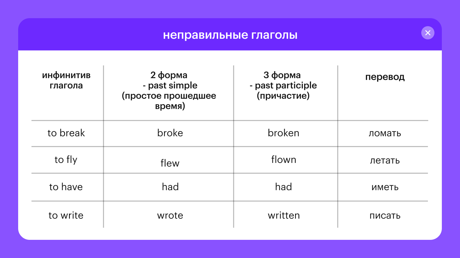 С ума можно сойти, правда? Но не волнуйся, лингвисты составили список неправильных глаголов английского языка с переводом, которая поможет разобраться в этом.