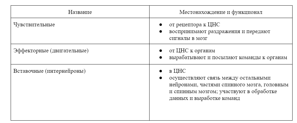 Нейроны делятся на 4 типа по строению: униполярные, биполярные нейроны, псевдоуниполярные и мультиполярные.