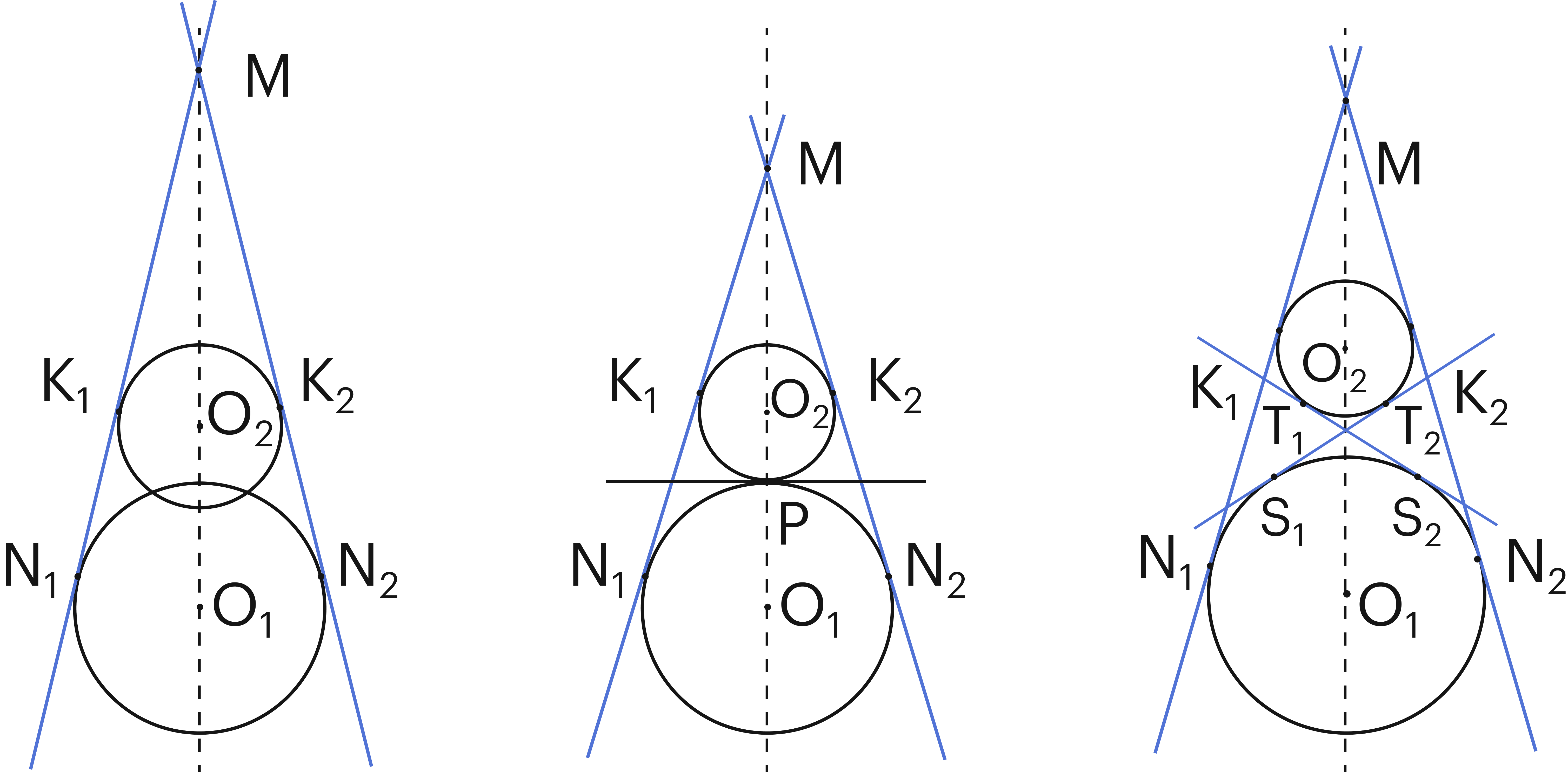 Если все точки каждой окружности являются внешними относительно другой окружности, то эти окружности имеют четыре общие касательные. (рис.3)