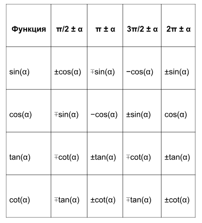 Таблица приведения тригонометрических функций:
