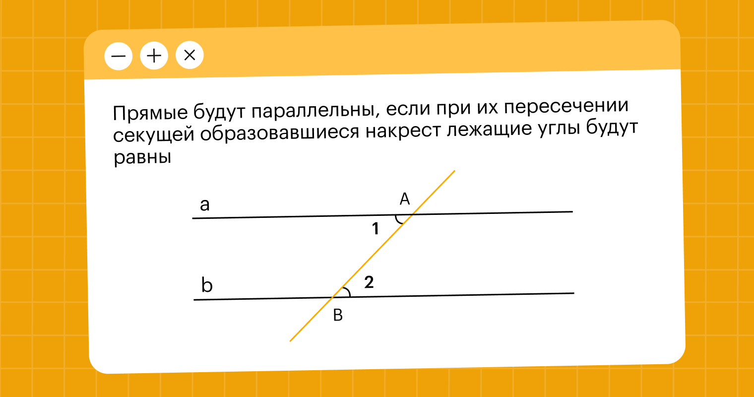 Перед нами две прямые - a и b. Представим, что их пересекла некая секущая (на то она, собственно, и секущая) в точках А и B. Таким образом накрест лежащие углы 1 и 2 будут равны.