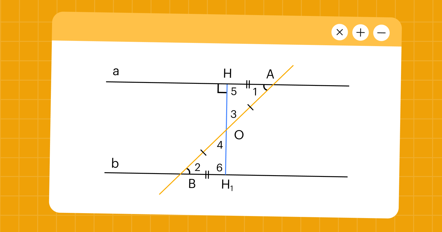 А теперь следим за руками! Если ∠3 = ∠4, то Н1 будет принадлежать лучу НО. Из равенства ∠5 и∠6 (где угол 5 -прямой, так как НО ⊥ a) будет следовать, что ОН1 ⊥ b, а значит, что НН1 - перпендикуляр как для a, так и для и b. Исходя из уже упомянутого нами свойства (перпендикуляр к одной из двух параллельных прямых другой, служит перпендикуляром и для второй) можно сделать вывод, что a || b.