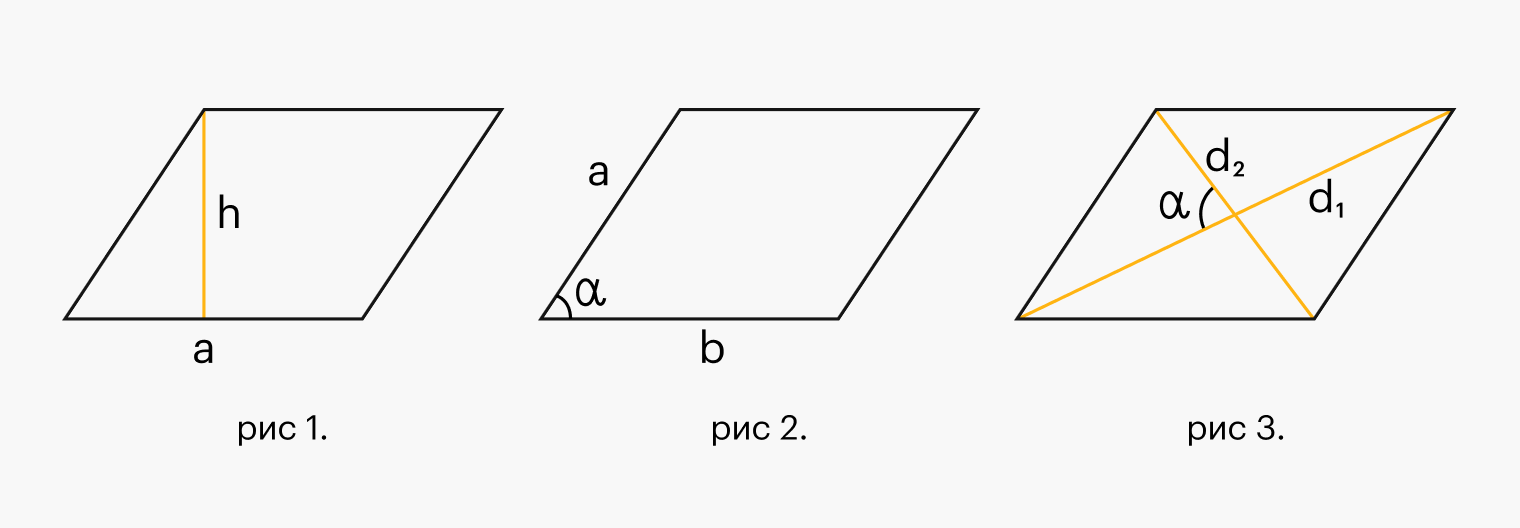Площадь параллелограмма можно найти несколькими способами — в зависимости от того, какие данные о фигуре у нас есть, а каких не хватает.