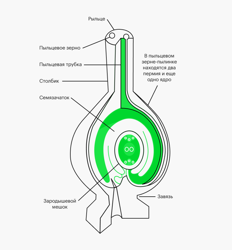 Когда первое пыльцевое зерно достигает яйцеклетки, они соединяются. Происходит оплодотворение.