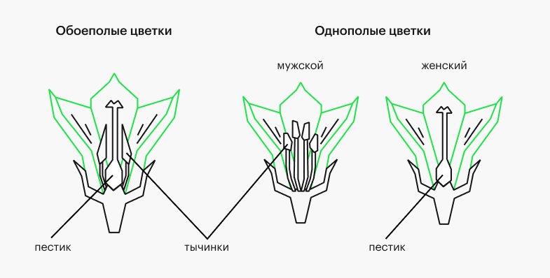 При этом раздельнополые растения бывают двух видов: