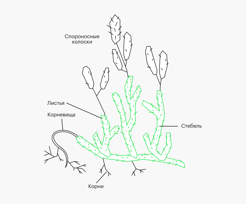 Как и другие высшие растения, плауны имеют корни, стебель и листья. Но у них есть очень характерная особенность: наличие горизонтального и вертикальных побегов.