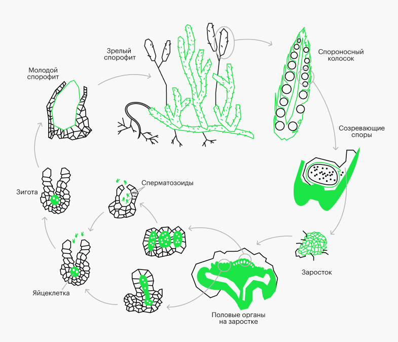 Жизненный цикл плаунов похож на циклы всех остальных высших растений. В нём чередуются две фазы — спорофит и гаметофит. Если ты не знаешь, что это такое — прочитай нашу статью.
