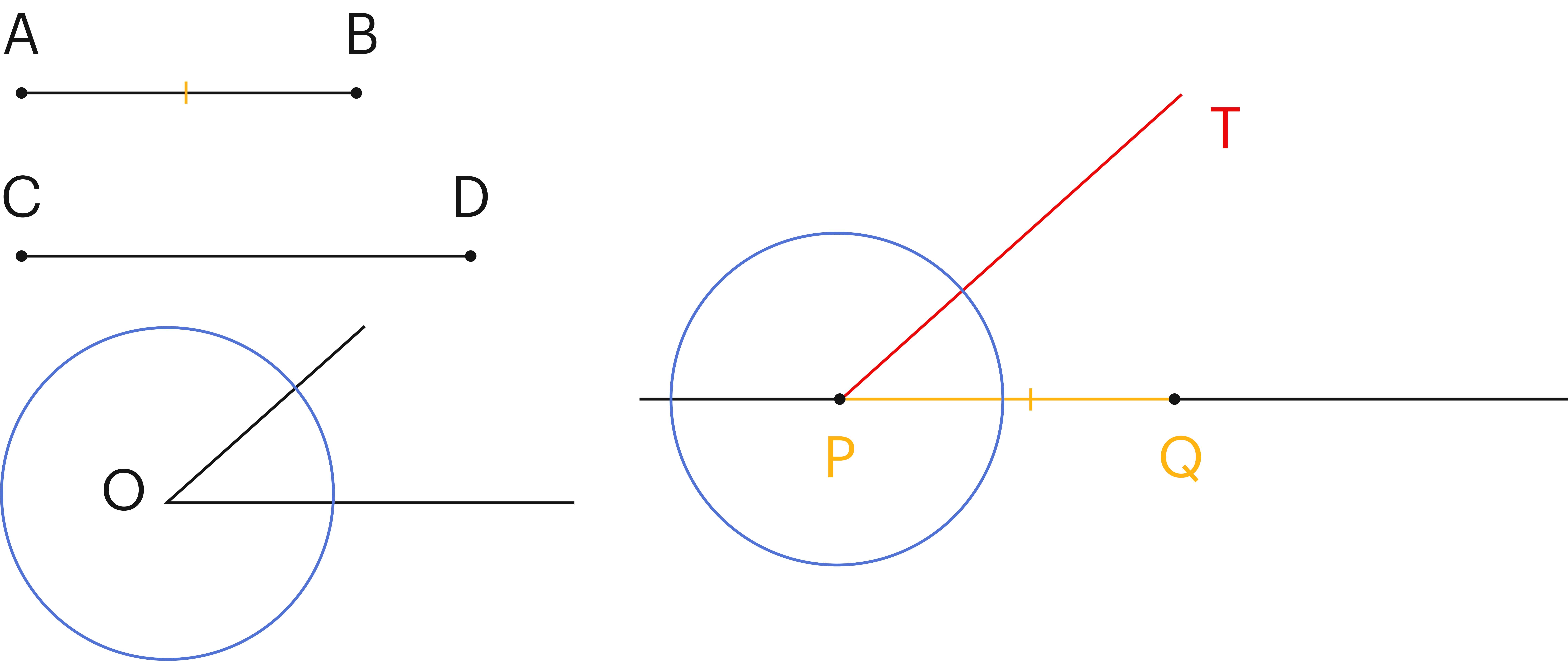 Пользуясь циркулем, строим угол TPQ, равный углу O