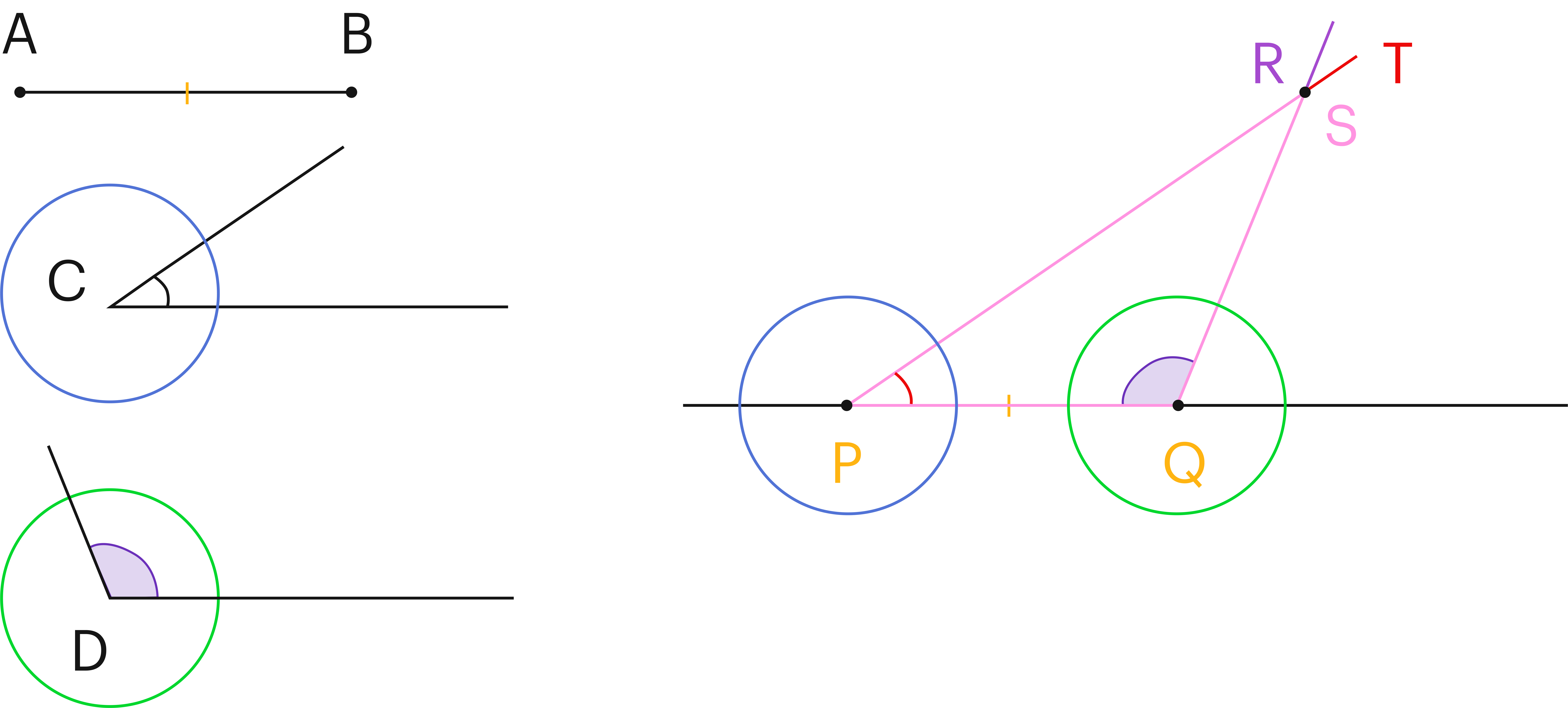 Пользуясь циркулем, строим угол TPQ, равный углу C